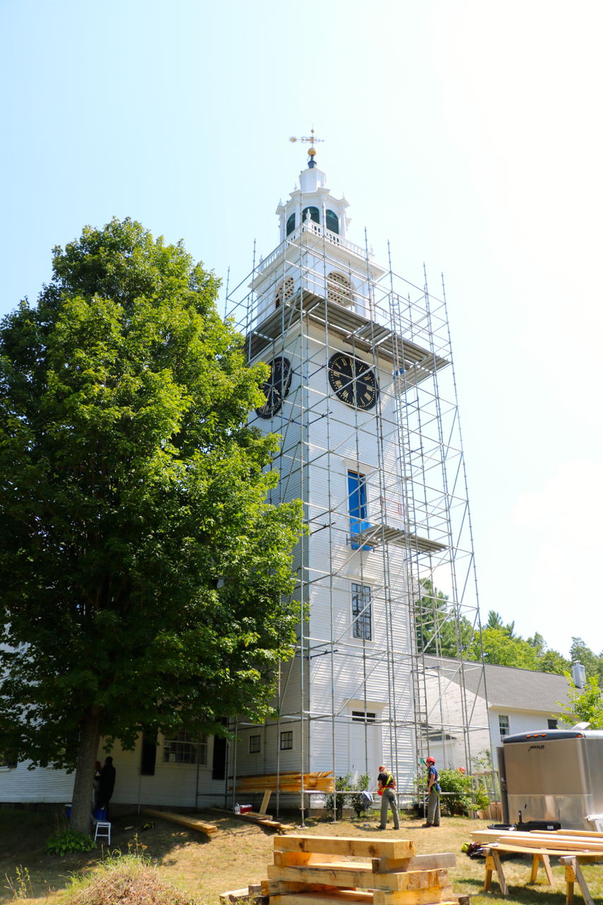 FRIDAY AUGUST 28 — At the FPC Meetinghouse Tower Takedown project, we sadly had to remove a maple too close to the Meetinghouse. The building looks happier without it, though. Read more in the captions.